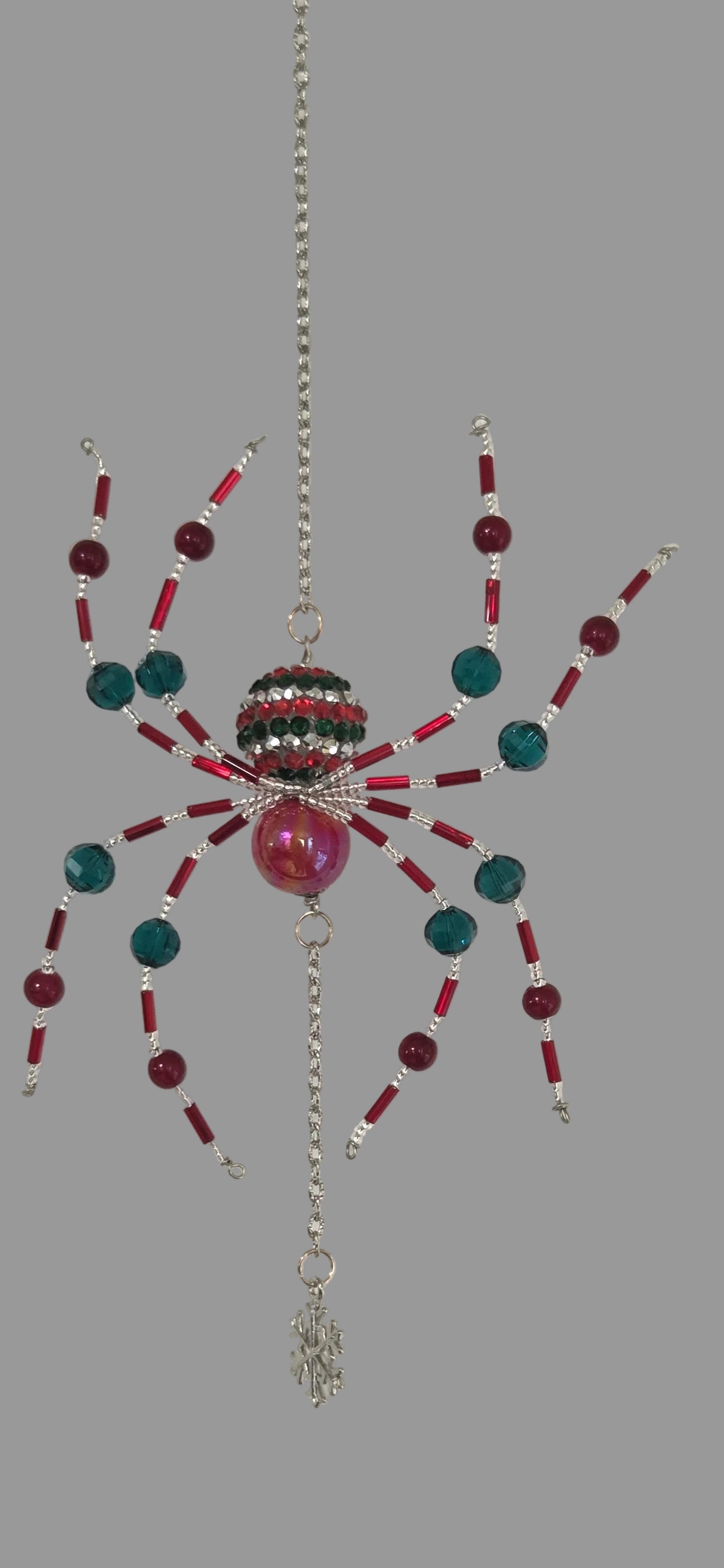 Red, white, and green spider holding a snowflake charm